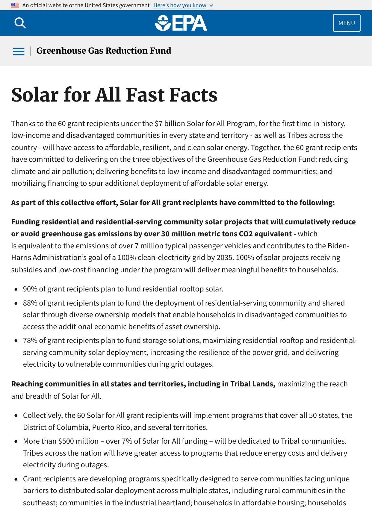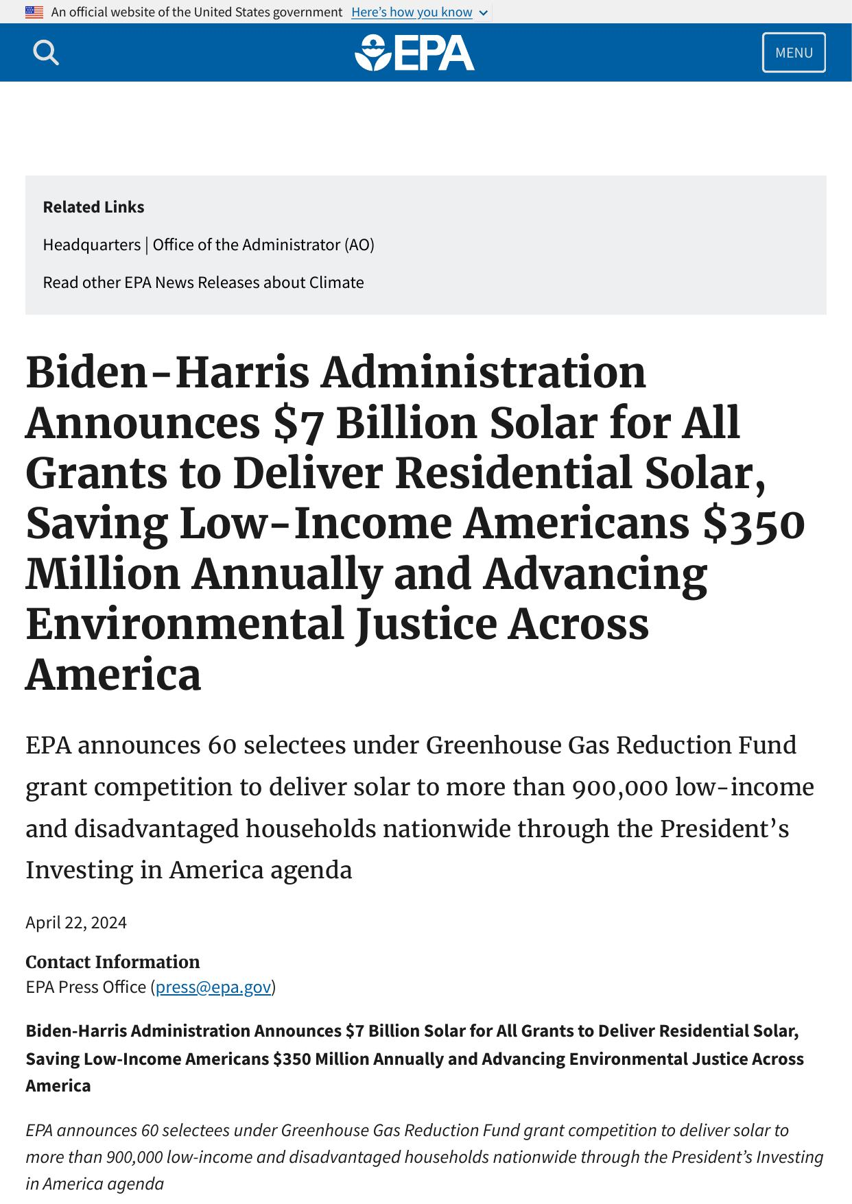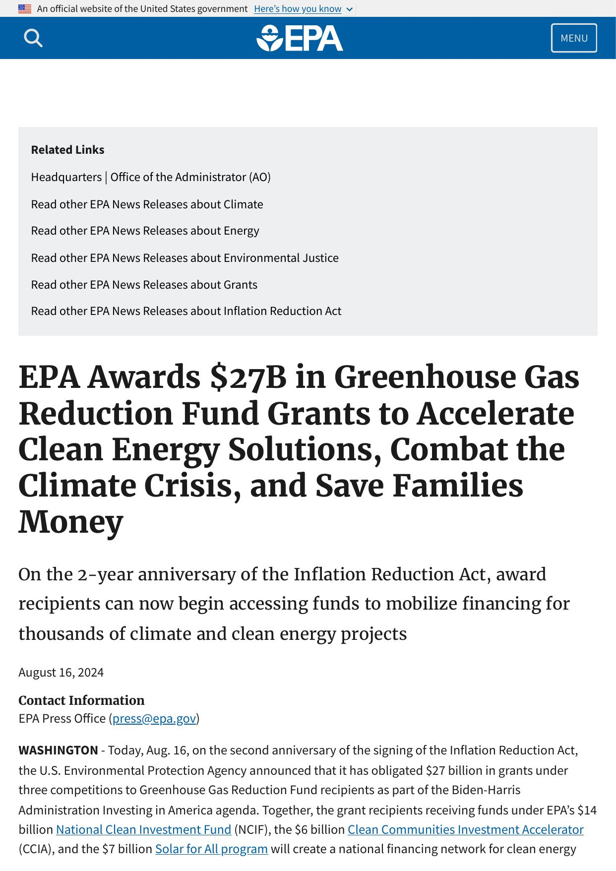 EPA Awards $27B in Greenhouse Gas Reduction Fund Grants to Accelerate Clean Energy Solutions, Combat the Climate Crisis, and Save Families Money
