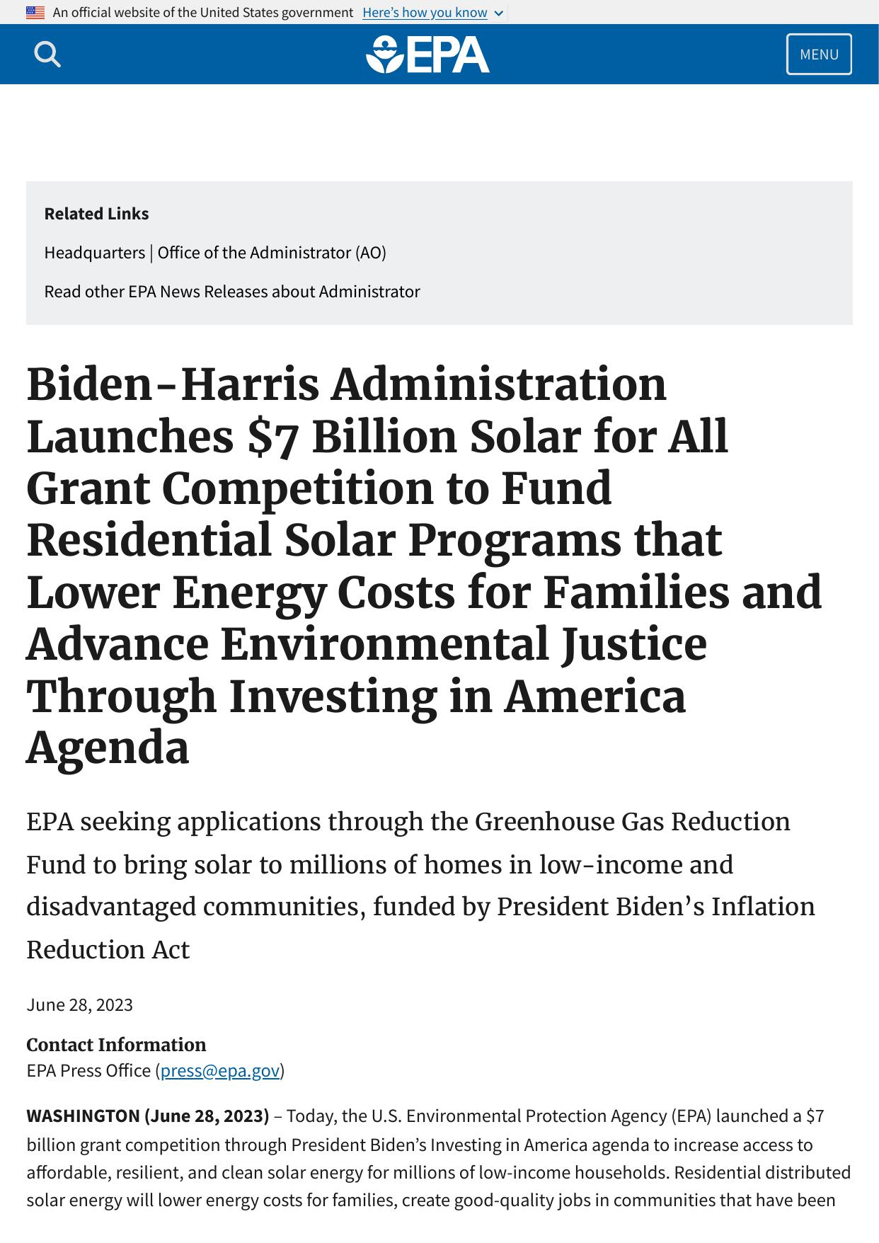 Biden-Harris Administration Launches $7 Billion Solar for All Grant Competition to Fund Residential Solar Programs that Lower Energy Costs for Families and Advance Environmental Justice Through Investing in America AgendaNick Nigro2023-06-28T00:00:00-04:00